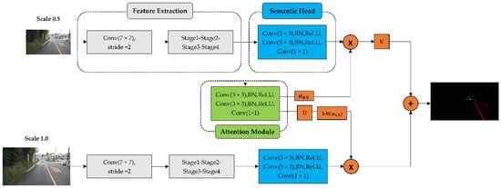First, the original image is scaled by and ( means that the number of pixels on a side is resized to times, while means no operation), such that we have multiscale inputs of and , denoted as , as shown in Figure 4. Images at two scales are passed through the same feature-extraction part to obtain feature maps with semantic information. The feature maps then go through the semantic head and attention module. The semantic head performs the semantic prediction (), and the attention module produces attention weights () over all spatial positions. It should be noted that the attention weights are learned from the adjacent scale pairs in the training process, which are the input scales of and in this example. The learned attention weights are considered relative attention weights between the adjacent scale pairs. Thereafter, the output mask of scale is produced by the pixel-wise multiplication of semantic prediction and attention weights . The equation can be formalized as: