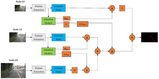 The procedure of the inference process is similar to that of the training process. Because the attention weights are learned between adjacent scales in the training process, different multiscale inputs can be selected at the inference time. Here, we explain the inference process using the three inputs, the scales of which are , denoted as , as shown in Figure 5. We obtain the final output mask () by combining the semantic predictions of these three different scale inputs based on the attention modules.
