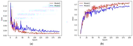 The loss and mIoU of Model 1 and Model 2 on the test set during the training process: (a) loss; (b) mIoU.