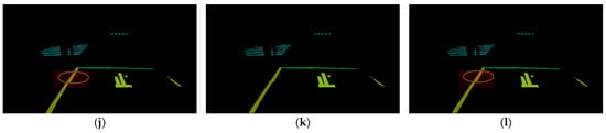 Examples of the results obtained by Model 1 and Model 2 with five kinds of multiscale inputs are shown in Figure 7. Apart from the result of , the results of the other multiscale inputs seem to be credible. For the result of obtained by Model 1 (Figure 7c) and Model 2 (Figure 7h), a clear misprediction indicated by the red ellipse can be observed. We assume that the short white line in the red ellipse was incorrectly predicted as the stop line because the scale was used to allow the network to pay more attention to the fine details. However, the other multiscale inputs (Figure 7e,g,j,l) containing scale do not show this trend. We believe that scale successfully weakens the effect of scale because there are more relatively large road markings in the RMD.