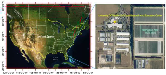 The study area (27°45′40″N, 82°13′40″W) was situated at the University of Florida’s Gulf Coast Research and Education Center (GCREC), located in Wimauma, Florida, USA (Figure 1). We conducted UAV surveys and in-situ biomass measurements during the winter growing season from 19 November 2020 to 3 March 2021. Two 100-m-long beds cultivated with seventeen strawberry genotypes (Table 1) were established. Each bed contained sixteen plots, and each plot was planted with seventeen plants, each corresponding to one of the genotypes tested in this experiment. The genotypes represented the range of canopy structures in the UF strawberry breeding germplasm, as well as varieties with unique canopy structures and sizes from other breeding programs. A code using capital letters (A–Q) was marked on the bed surface near each strawberry plant to indicate its genotype. Approximately every week, two plots were randomly selected, and thirty-four plants were removed to the laboratory for dry biomass measurements. The UAV multispectral imagery was acquired within a few hours prior to plant removal. The plants were placed in a drying oven at 65 °C for 5 days to obtain the dry biomass weight. There was a total of 532 strawberry plant samples in the 2020–2021 season. The detailed information of genotypes and plots is shown in Table 1.