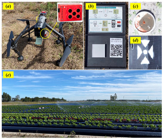 UAV systems and GCP setup: (a) the Inspire 2 platform equipped with a MicaSense RedEdge-M multispectral camera; (b) the calibration reflectance panel (CRP); (c) GCPs around the strawberry beds (M1–M8); (d) GCPs on the plastic beds (N1–N16); (e) strawberry farm.
