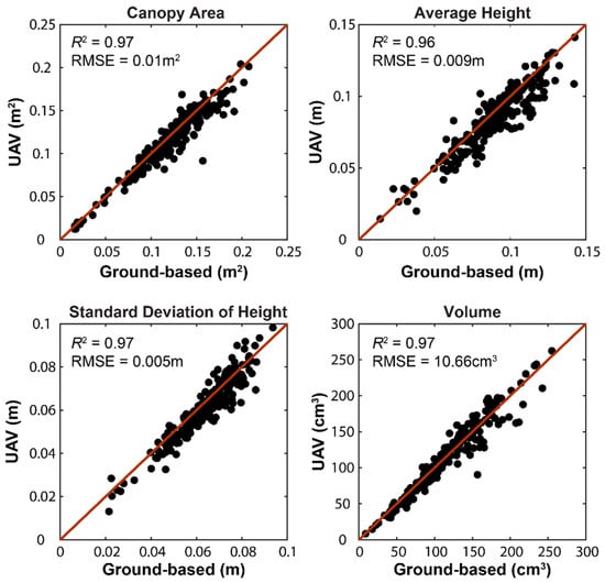 Scatterplots showing ground-based and UAV image-derived strawberry canopy structural parameters, including the canopy area, average height, standard deviation of height and volume.