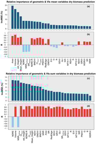 The relative importance of image-based features in the prediction of strawberry biomass: (a) importance of geometric parameters and VI mean variables for modeling dry biomass; (b) correlation coefficients of geometric parameters and VI mean variables with dry biomass; (c) importance of geometric parameters and VI sum variables for modeling dry biomass; (d) correlation coefficients of geometric parameters and VI sum variables with dry biomass. The dark green strip represents the mean decrease accuracy (%IncMSE) of various variables. The red and cyan strips represent the positive and negative correlations between the study variable with the dry biomass, respectively.