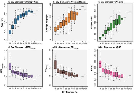 Box plots showing the variations in strawberry canopy geometric parameters and VIs with the increase in dry biomass. (a): dry biomass vs. canopy area, (b): dry biomass vs. average height, (c): dry biomass vs. volume, (d): dry biomass vs. MSRRedEdge, (e): dry biomass vs. SRRedEdge, (f): dry biomass vs. NDRE. The x axis represents different biomass intervals. For dry biomass, the interval is set as 10. For example, “10” and “20” represent the ranges of [0, 10] and [10, 20], respectively.
