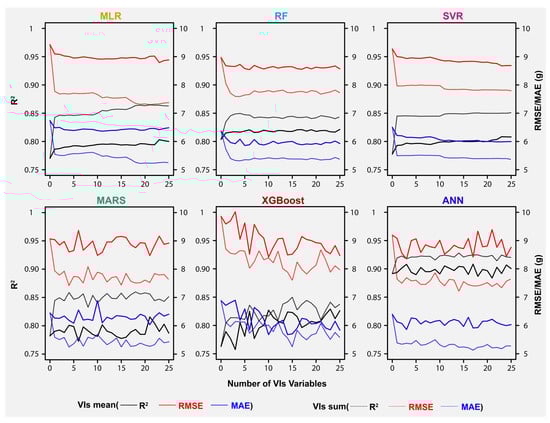 Unlike grasses and grain crops such as wheat, strawberries are dicots and have a more complex plant structure. Thus, two types of VI calculations (mean and sum) were performed for each plant, as described in Section 2.4.3. There was a certain degree of multi-collinearity between the 25 VIs (Figure S1 in the supplementary file). Machine learning techniques have been proven to effectively tackle the multi-collinearity problem and make full use of strongly collinear VIs in previous studies [,,]. In this study, six regression techniques (MLR, RF, SVR, XGBoost, MARS and ANN) were adopted and examined for the biomass prediction. However, the increase in the number of VIs input did not result in a sustained improvement in model performance. The validation accuracy of MARS, XGBoost and ANN fluctuated after importing VIs of relatively low importance into the model, which may have been caused by overfitting. Therefore, we selected six VI variables combined with four geometric parameters to evaluate the above models.