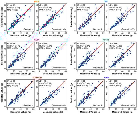Scatterplots of in-situ measured plant dry biomass vs. predicted values using six prediction models: MLR, RF, SVR, MARS, XGBoost and ANN. For each method, the performance was compared using only geometric parameters and all features (geometric parameters and VI sum variables).