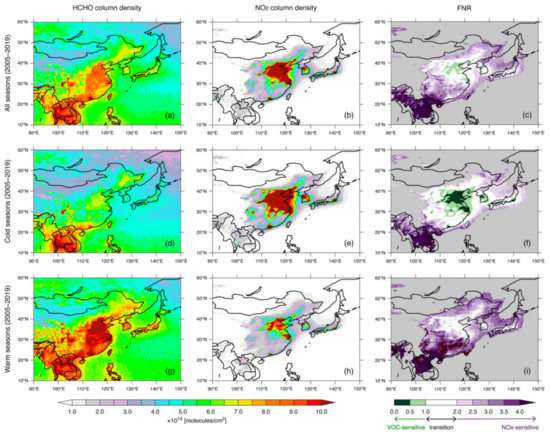 Spatial distribution of (a,d,g) HCHO column density, (b,e,h) NO2 column density, and (c,f,i) FNR over East Asia averaged over 15 years (2005–2019) during (a–c) all seasons, (d–f) cold seasons (October to March), and (g–i) warm seasons (April to September). FNR is analyzed at grid points where NO2 column density is greater than 1.0 × 1015 molecules cm−2 (white in (b,e,h)).