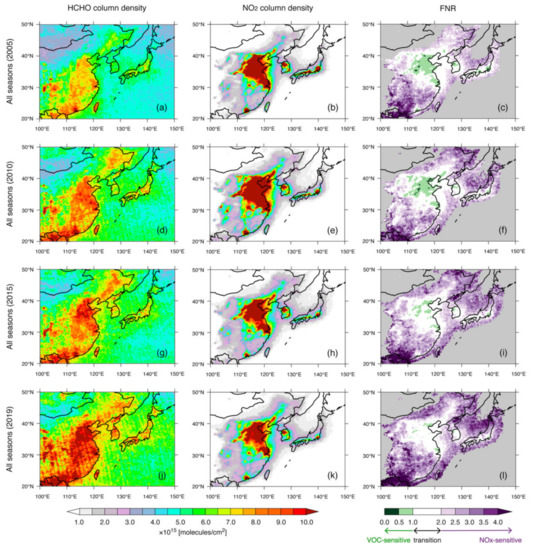 Spatial distribution of (a,d,g,j) HCHO column density, (b,e,h,k) NO2 column density, and (c,f,i,l) FNR over East Asia averaged over all seasons for the year (a–c) 2005, (d–f) 2010, (g–i) 2015, and (j–l) 2019. FNR is analyzed at grid points where NO2 column density is greater than 1.0 × 1015 molecules cm−2 (white in (b,e,h,k)).