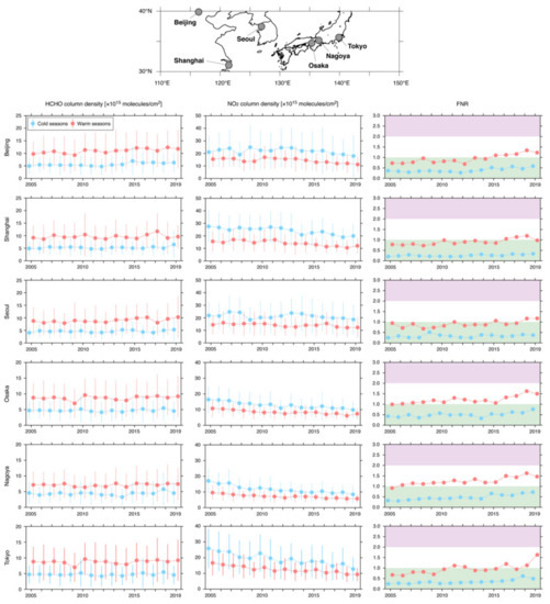 Temporal variation of HCHO column density, NO2 column density, and FNR during 2005–2019 over Beijing and Shanghai in China, Seoul in the Republic of Korea, and Osaka, Nagoya, and Tokyo in Japan averaged over cold seasons (light blue symbols) and warm seasons (light red symbols) for each year. The green, white, and purple shading in the FNR panels indicates VOC-sensitive, transitional, and NOx-sensitive regimes, respectively.