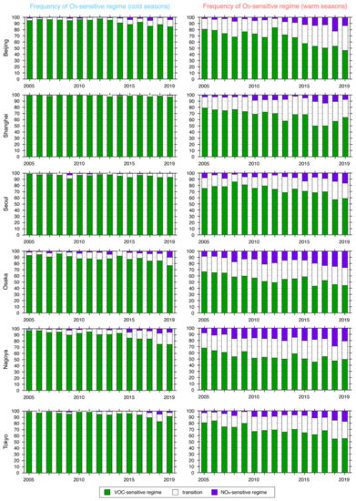 The gradual shift from the VOC-sensitive to NOx-sensitive regime was indicated by the FNR value, and this was clarified further by determining the frequency of occurrence of the O3-sensitive regime during the 15-year period (Figure 5). The O3-sensitive regime was identified by the conventional threshold values (see Section 2.1) and the frequency was analyzed over the cold and warm seasons for each year. Over the cold seasons, the VOC-sensitive regime was dominant and the NOx-sensitive regime did not appear during the first part of the period, whereas the transitional or NOx-sensitive regime was found at frequencies of 10–20% during the latter part of the period. The trends were clarified during warm seasons rather than cold seasons. During warm seasons, all six megacities were mostly dominated by the VOC-sensitive regime with frequencies of 70–80%, and the NOx-sensitive regime only occurred at a frequency of around 10% during the first part of the period. The frequency of the VOC-sensitive regime gradually declined over the period, and the NOx-sensitive regime occurred at a frequency of 10–20% during the latter part of the period. The frequency of occurrence of the transitional regime also gradually increased, and as a result, the VOC-sensitive regime occurred with a frequency of 50–60% during the latter part of the period. This analysis of the frequency of the O3-sensitive regime also indicated the gradual shift from the VOC-sensitive to NOx-sensitive regime over megacities in East Asia.