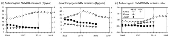 Annual amounts of anthropogenic emissions of (a) NMVOC and (b) NOx, and (c) the NMVOC/NOx ratio over China (white circles, left axis), the Republic of Korea (gray diamonds, right axis), and Japan (black squares, right axis) during 2005–2015 calculated from REAS. The values over China during 2015–2019 calculated from MEIC are also shown (light-gray circles, left axis).