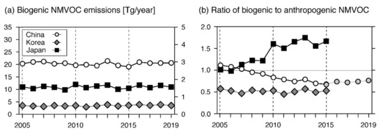 (a) Annual amounts of NMVOC biogenic emissions over China (white circles, left axis), the Republic of Korea (gray diamonds, right axis), and Japan (black squares, right axis) during 2005–2019. (b) The ratio of biogenic to anthropogenic NMVOC emissions over China (white circles), the Republic of Korea (gray diamonds), and Japan (black squares). The values are calculated based on REAS during 2005–2015, and the values over China during 2015–2019 are also calculated based on MEIC (light-gray circles; see also Figure 6).