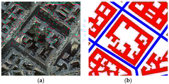 The experiments in this paper are mainly based on three publicly available datasets. The first dataset is the CITY-OSM dataset [30], with a total of 825 images of 2611×2453 pixels each. The images were randomly selected in a ratio of 4:1, of which 660 images were used as the training set and the remaining 165 images were used as the test set. The test set’s true-color images and labeled maps are shown in Figure 1. The dataset has three categories, namely, background, buildings, and roads.