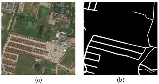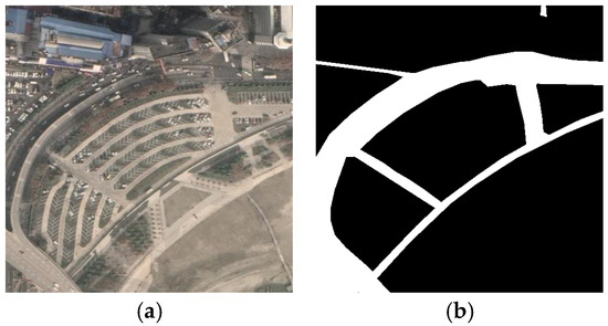 The second dataset is the DeepGlobe road extraction remote sensing map dataset, which has 6226 remote sensing images. Each image size is 1500 × 1500 pixels, randomly selected according to the ratio of 4:1, and 4981 images were used as the training set and the remaining 1245 images were used as test set. The test set’s true-color images and labeled maps are shown in Figure 2. The dataset has two categories, road and background categories. The DeepGlobe road extraction dataset is publicly available at https://competitions.codalab.org/competitions/18467, accessed on 18 June 2018.