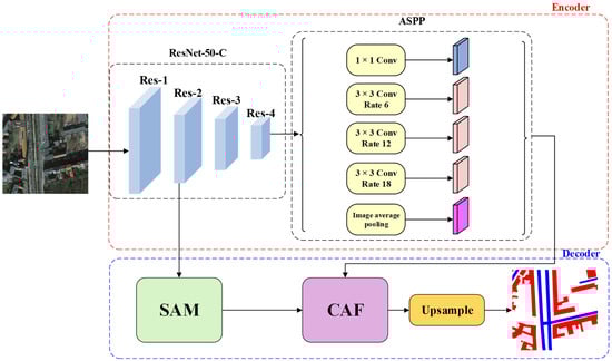 The network structure of this paper is shown in Figure 4. The backbone part of the network uses ResNet-50-C [33] to extract the features of the input image. ResNet-50-c replaces the 7 × 7 convolution kernels in the input part of ResNet-50 [20] with three 3 × 3 convolution kernels, which significantly reduces the number of parameters and computation. Firstly, we extract the feature map of the Res-2 section in ResNet-50-C and use the SAM to extract the horizontal and vertical local feature context information of this feature map. The output of SAM is used as the low-level features . The feature map of Res-4 in ResNet-50-C is fed into the ASPP [23] module, which obtains the global and multiscale information of the feature map by convolving the voids using different expansion rates. The output of ASPP is used as the high-level features . Finally, the channel attention fusion module (CAF) fuses the low-level features with the elapsed high-level features and up-samples them to obtain the final prediction results.