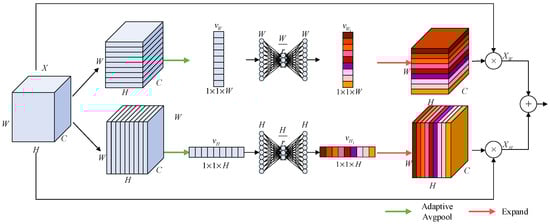 The SAM is shown in Figure 5. Firstly, the process of column pixel feature extraction is illustrated in the upper branch of Figure 5. To study the distribution of column pixels, averaging pooling is performed for each row of data of the input feature mapping to determine a -dimensional column feature vector . Its data point is given by: