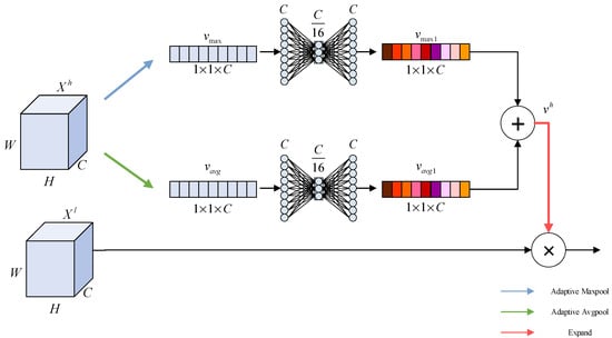 Vector and vector highly aggregate the category information of high-level features. The sum of both results is . The final result is obtained by multiplying this vector with the low-level feature . The low-level feature is rich in position information, and the high-level feature is rich in category information, and the two are fused by using a multiplication operation.