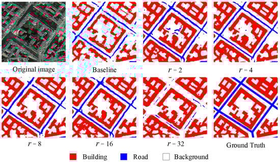 The results based on the CHN6-CUG dataset set with different dimensionality reduction rates are shown in Table 3. As can be seen from Table 3, the MIoU value of all the networks with the SAM is higher than that of the baseline network. When , the IoU value of the road is 1.6% higher than that of the baseline network, and the MIoU value is 0.87% higher than that of the baseline network. In this case, the optimal segmentation result is obtained. This indicates that the module has the best performance when .