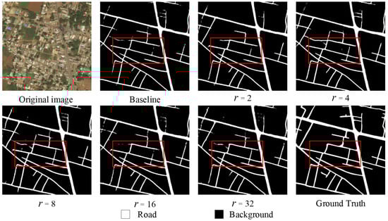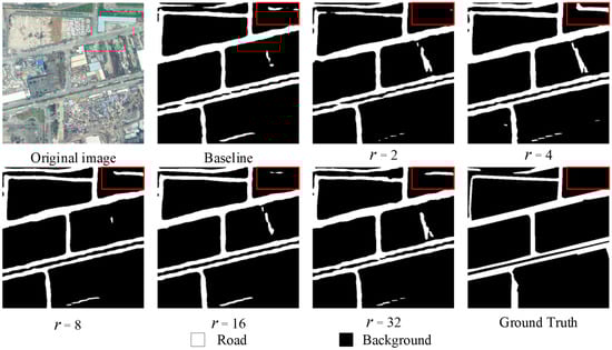 A comparison of the visual results for the Table 2 experiments is shown in Figure 10. The area marked by the red box in the figure shows that the segmented road of the network with the addition of the SAM is clearer and can reduce the number of road disconnections. The best results are obtained when . This is consistent with the experimental data obtained in Table 2.