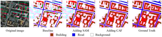 Again, the network shown in Figure 7 is used as the baseline network for the analysis of module effectiveness. The SAM and the CAF are added successively after the baseline network to evaluate the module effectiveness. The is set uniformly in the experiments, and Table 4 shows the segmentation accuracy when different modules are added separately to the baseline network based on the CITY-OSM dataset.
