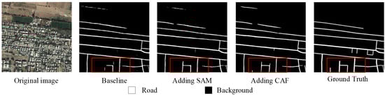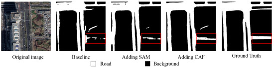 The visual comparison results listed in Table 6 are shown in Figure 14. The SAM module is added after the Res-2 section, and the CAF module uses the combination of maximum pooling and average pooling. When no modules are added, the roads in the red box area are barely recognizable. With the addition of SAM and CAF, more and more roads are identified, and the rest of the road in the picture becomes clearer. The shape of the road is also closer to ground truth, which matches the numerical results obtained in Table 6.