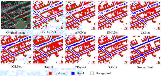 The comparison results based on the CITY-OSM dataset with other segmentation networks are shown in Table 7. The MIoU of SANet reaches 72.20%, obtaining the best segmentation results compared to other networks, and the IoU of each category is higher than the others. For the road category, the IoU value of SANet reaches 77.55%, which is 0.43% higher than that of the suboptimal DNLNet, proving the superiority and effectiveness of SANet for road segmentation. The IoU values for the background and building categories were on average about 1% higher than the other networks. The experimental results show that SANet can extract the information from various categories better and the segmentation of each pixel is more accurate.