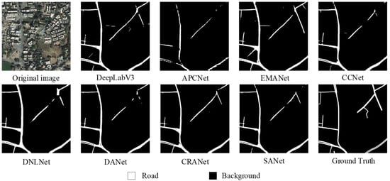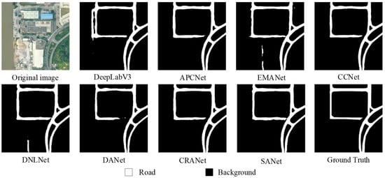 In order to evaluate the performance of SANet in road extraction, DeeplabV3 [34], APCNet [35], CCNet [36], DANet, EMANet [37], and DNLNet [38] are used for comparative experiments and analysis. DeeplabV3 introduces atrous spatial pyramid pooling to extract multi-scale information; APCNet integrates multi-scale, self-adaptation, and global-guided local affinity to design the network and obtains good results. DANet models channel attention and spatial attention to extract features. EMANet designed the expectation maximization attention mechanism (EMA), which abandons the process of calculating the attention map on the whole graph. Instead, we iterated a set of compact bases through the expectation maximization (EM) algorithm and ran the attention mechanism on this set of bases, thus greatly reducing the complexity. DNLNet increases the accuracy and efficiency of road segmentation by decoupling the non-local [39] module.