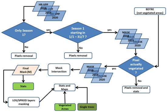 Taking care about these tests, native masks were further refined excluding all those occurrences not corresponding to vegetated areas. Discrepancies among years were then investigated through comparison of yearly occurrences. Final masks (My, one per year) were finally intersected to obtain a single one (namely, M) mapping all pixels verified as permanently vegetated along the three years. M was then used for masking LOS and SPROD layers, thus permitting to focus the analysis on those pixels reasonably associated to a vegetated element active for all the three investigated years. A synthetic flowchart is reported in Figure 2.
