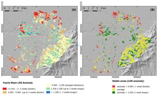 Figure 5A shows the spatial distribution of the average LOS anomalies resulting by averaging the three yearly values. Five classes were mapped: (i) one mapping patches showing an average LOS anomaly < 0.0892 corresponding to those areas where the growing season is somehow shorter more than 3 weeks with respect to the mean; (ii) one mapping patches having a growing season shorter up to 3 weeks with respect to the mean (0.892–0.964); (iii) one mapping patches having an average growing season (0.964–1.036); (iv) one mapping patches having a growing season longer up to 3 weeks with respect to the mean (1.036–1.108); and (v) one mapping patches having a growing season longer more than 3 weeks with respect to the mean (>1.108). Figure 5B, differently, is intended to show those patches that constantly behave along the three investigated years always over, under or similar to the yearly mean value of LOS. In other words, those vegetated patches that constantly show a shorter, longer, or average duration of their growing season. In Table 5, some summarizing statistics are reported.
