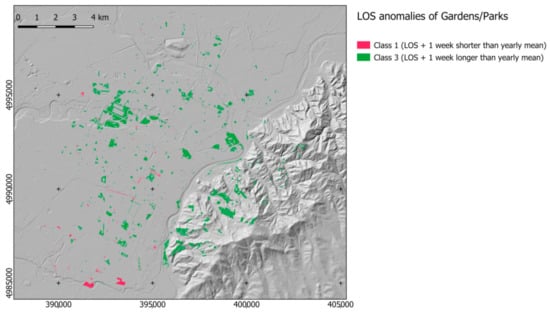 While focusing on parks/garden class (Figure 6), it can be noted that the most of patches (about 92%) shows a positive LOS anomaly, while only a minority has a negative one, i.e., LOS value shorter than yearly mean. This can be interpreted as a result of the good ordinary management practices for public green areas exploited by the municipality administration. Moreover, spatial distribution of patches of LOS positive class is uniformly spread within the city, suggesting that management practices are more conditioning LOS than vegetation type and local urban conditions. This ensures longer lasting beneficious effects provided by active vegetation to citizens.