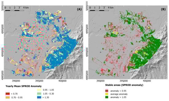 (A) Spatial distribution of the 3-year average SPROD anomaly over Torino. Anomaly is computed according to Equation (3). Five classes were mapped: one mapping areas showing an average SPROD value smaller than 70% of the average one (<0.7); one mapping areas showing an average SPROD value smaller down to 70% of the average one (0.7–0.95); one mapping areas showing a SPROD value (0.95–1.05) comprised in the range “average SPROD” ± 5%; one mapping areas showing an average SPROD value up to 70% higher than the average one (1.05–1.3); and one mapping areas showing an average SPROD value more than 70% higher than the average one (>1.3). (B) Map showing areas that, in the three investigated years, always behaved similarly in term of LOS anomaly (averagely shorter, equal, or longer then the yearly mean SPROD of the area). Reference frame is WGS84 UTM 32N.