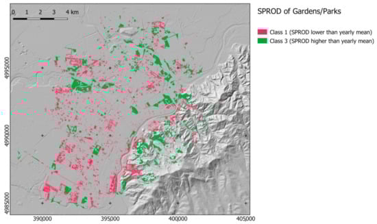 A specific focus was done on gardens and parks. It was noticed that the majority of patches shows longer LOS, probably thanks to the ordinary good management practices operated by the municipality administration. No remarkable finding, useful to improve management, was obtained about the spatial distribution of LOS and SPROD anomalies of parks and gardens, showing that there is no specific part of the city that benefits more than another in term of season length or of biomass production.