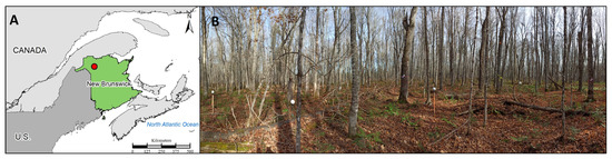 (A) Study site located in Jardine Brook North-Western New-Brunswick, Canada (47°25′21.70″N, 67°31′5.84″W); (B) photography of the northern hardwood stand surveyed in the fall under leaf-off conditions.