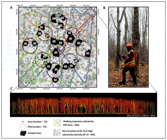 (A) Map of the 1 ha hardwood site (47°25′21.70″N, 67°31′5.84″W), showing the TLS and MLS data acquisition patterns, as well as the location of the 26 sample trees located on a MLS slice of points of 0–7 m high that illustrates the terrain and surrounding trees (NAD 1983 CSRS New Brunswick Stereographic); (B) Survey of the stand with the Hovermap MLS system; (C) A 15 m cross-section of the 1 ha MLS point cloud on a 140 m diagonal colorized by intensity (low: red; high: green).