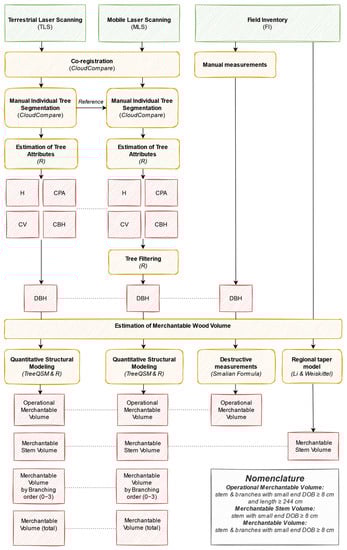 The overall data processing workflow for TLS and MLS, in Figure 3, shows the main steps performed in this study to extract tree structural attributes. These steps included: (i) co-registration and manual individual tree segmentation of TLS and MLS data (Section 3.1); (ii) estimation of tree attributes (Section 3.2); (iii) tree filtering (Appendix A); (iv) estimation of merchantable wood volume (Section 3.3). The three types of merchantable wood volume estimated in this workflow were defined as follows: