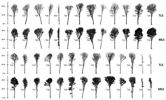 The application of automatic tree segmentation algorithms can impact the estimation of tree structural attributes [31]. Therefore, in this study, we adopted manual segmentation of the sample trees based on visual separability. This was done to minimize the impact of the segmentation process in assessing the accuracy of the estimated tree attributes. To do this, the nine geo-referenced TLS sample plots were first co-registered with the MLS point cloud using CloudCompare’s fine registration Iterative Closest Point (ICP) algorithm [32]. Each sample tree was then located in the TLS and MLS point cloud using the base and rover data, as well as its retro-reflective checkboard. The 26 sample trees were manually segmented from TLS and MLS point clouds using the “segment” tool from CloudCompare. The TLS sample trees were used as reference to assist the MLS manual tree segmentation. The average root-mean-square (RMS) error that was calculated automatically by the co-registration algorithm, over 50,000 points of the 26 TLS and MLS segmented trees pairs, was 3.6 cm. The TLS and MLS point clouds of the 26 manually segmented trees are presented in Figure 4.