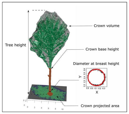 Tree H, CBH, CPA, CV, and DBH were estimated from the TLS and MLS point clouds of all manually segmented trees (Figure 5). All of these attributes were computed using R [33]: