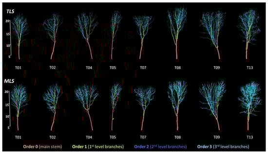 The QSM were generated for each tree using TreeQSM algorithm [9] (Figure 6). The approach described in [37] was used to optimize model parameters and select the best reconstruction. Comparison between the operational merchantable volume obtained from the destructive field measurements and that generated from QSMs were possible because all segments of the QSM smaller than 8 cm diameter were truncated, and the last branches that were shorter than 244 cm were removed using the R package “aRchi” [38]. The resulting modeled trees were, thus, consistent with the field protocol presented in Section 2.2. Additionally, the stem base of each TLS and MLS segmented tree was truncated at the stump height measured in the field after felling to match the destructive field reference. The QSMs included axes of four orders: order 0—main stem and 1st, 2nd, and 3rd-order branches (Figure 6). A fine analysis comparing merchantable volume of TLS and MLS by branching order (up to 3rd) was performed. Finally, the merchantable stem volume, extracted from lidar QSMs, was compared to the merchantable stem volume estimated with species–specific regional taper models developed by Li and Weiskittel [39,40] (Section 3.4).