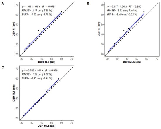 Comparison of diameter at breast height (DBH) between (A) field inventory (FI) and TLS, (B) FI and MLS, and (C) TLS and MLS for the 26 sample trees. The blue line represents the linear regression. The grey zone is the 95% confidence band for predictions. The dashed black line represents the 1:1 line.