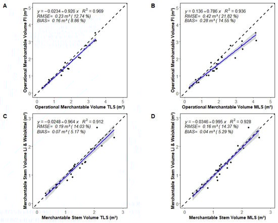 (A,B) Comparison of operational merchantable volume derived from the destructive field inventory (FI) (i.e., stem and branches with small end diameter outside bark (DOB) ≥ 8 cm and length ≥ 244 cm) with the QSM-derived value (i.e., branching order 0–3 with small end DOB ≥ 8 cm and length ≥ 244 cm) from (A) TLS and (B) MLS data. (C,D) Comparison of the merchantable stem volume derived from Li and Weiskittel’s taper model (i.e., main stem with small end DOB ≥ 8 cm) with the QSM-derived value of the stem (i.e., branching order 0 with small end DOB ≥ 8 cm) from (C) TLS and (D) MLS data. n = 26 trees. The blue line represents the linear regression. The grey zone is the 95% confidence band for predictions. The dashed black line represents the 1:1 line.