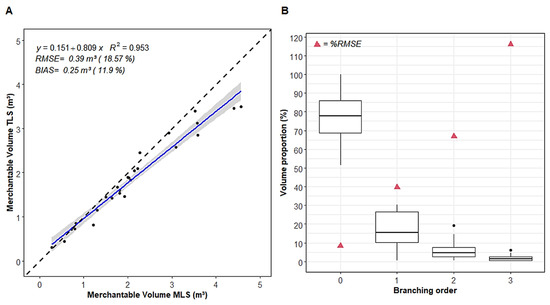 (A) Comparison of total merchantable volume (i.e., stem and branches with small end diameter outside bark (DOB) ≥ 8 cm) derived from TLS and MLS QSMs (i.e., branching order 0–3 with small end DOB ≥ 8 cm). n = 26 trees. The blue line represents the linear regression. The grey zone is the 95% confidence band for predictions. The dashed black line represents the 1:1 line. (B) Boxplots of the proportion of merchantable volume by branching order (0 = main stem; 1 = first-level branches; 2 = second-level branches; 3 = third-level branches) from TLS QSMs. Red triangles represent the %RMSE by branching order.