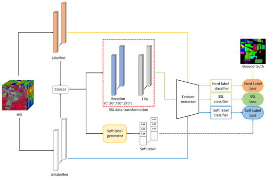 Deep-learning-based HSI classification has still faced some difficulties [8,29,30]. The acquisition of labels for hyperspectral data mainly takes place via manual annotation, which is costly and time consuming, leading to difficulties in acquiring labeled samples. Therefore, how to achieve HSI classification using a small number of labeled samples is a meaningful problem. In fact, deep neural networks contain a large number of parameters and often require as many training samples as possible. With only a small number of labeled samples available (e.g., only five labeled samples per class), deep neural network training is prone to overfitting, resulting in very low test accuracy. To solve this problem, it is common to treat HSI classification as a few-shot task in deep learning [6,31]. Liu et al. [32] learned a metric space in the training dataset and generalized it to the classes of the test dataset, achieving better classification accuracy with only a small number of samples. In contrast, in [31], the similarity relationship between samples is learned through a relational network, thus changing the simple way of using Euclidean distance. Cao et al. [33] combined active learning and deep learning to reduce the required labeling cost. Another way to address the lack of labeled samples is to introduce self-supervised learning into HSI classification [5,34]. Self-supervised learning mainly uses the auxiliary task (pretext) to mine its own supervised information from large-scale unsupervised data, and the entire network is trained by the supervised information constructed so that it can learn valuable representations for downstream tasks [35]. The above methods alleviate the problem of inadequate samples to some extent, but do not make deeper use of unlabeled samples. HSI contains a small proportion of labeled samples, and most of them are unlabeled. Most of the existing methods focus on how to make full use of the information contained in the labeled samples, neglecting the use of the information in the more unlabeled samples; therefore, how to make better use of these unlabeled samples is a key issue in terms of improving the classification accuracy.