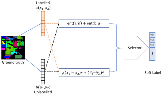 where (,), (,) are the two-dimensional spatial coordinates of the labeled and unlabeled samples on the HSI, respectively. The spectral distance is calculated using a commonly used spectral similarity measure, Kullback–Leibler divergence [61]: