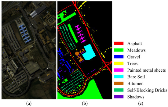 University of Pavia data set: The University of Pavia data set was made using Germany’s airborne reflection optical spectral imager imaging of Pavia city in Italy in 2003. The spectral coverage range was 430~860 nm, and the image size is 610 × 340 pixels, as shown in Figure 5. There are 42,776 pixels including ground objects, with a spatial resolution of 1.3 m. After removing the bands affected by noise, the remaining 103 bands can be used for classification. The dataset annotated 9 land features.