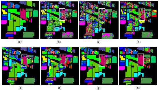 Graph of classification results of IP dataset. The highlighted white box in each subfigure is to compare the classification results more clearly. (a) Ground truth (GT). (b) SVM. (c) 2DCNN. (d) 3DCNN. (e) DFSL. (f) RN-FSC. (g) SSAD. (h) SSKD.