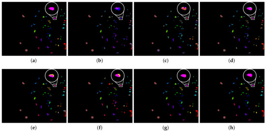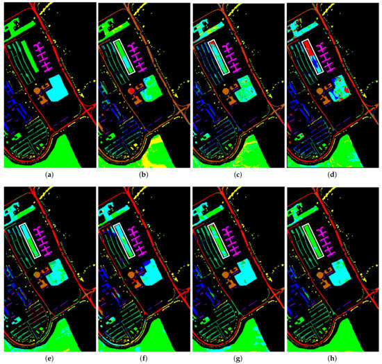 Graph of classification results of UP dataset. Similar to Figure 7, the highlighted white box in each subfigure is used to compare the classification results more clearly. (a) Ground truth (GT). (b) SVM. (c) 2DCNN. (d) 3DCNN. (e) DFSL. (f) RN-FSC. (g) SSAD. (h) SSKD.