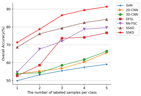 - The approaches using soft label SSAD and SSKD performed better overall compared to the traditional methods SVM, deep-learning methods (2DCNN, 3DCNN), and few-shot-learning approaches. With only a small number of labeled samples, the previous methods only utilize a limited number of labeled samples, ignoring the problem of unlabeled sample utilization. The SSAD and SSKD, on the other hand, generate soft labels for the unlabeled samples and feed them into the network for training, fully exploiting the information contained in the unlabeled samples. The actual number of samples used is higher than other deep-learning approaches, allowing the model to extract more discriminative features from the images and achieve better classification results. The problem of a limited number of samples is overcome effectively.
