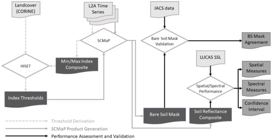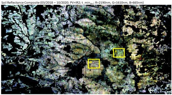 In the last few years, large-scale and systematic information about the status and development of soils has moved into focus [1,2] because there is an increased demand for agricultural production [3]. At the same time, soil erosion [4] and soil-health degradation can be observed [5]. Environmental covariates derived from Earth observation (EO) have already been used successfully for modelling soil information on a global [6] and continental scale [7]. Since the opening of the Landsat archives, the temporal compositing technique has become increasingly popular for many applications [8,9,10,11,12]. Optical multispectral EO archives have been explored for detecting bare soils from temporal data stacks on a per-pixel basis. Then, the bare soil pixels are averaged to create soil reflectance composites (SRC). Thus, the temporary covering of mostly agricultural soils with vegetation in single data takes can be partially circumvented, resulting in enlarged bare soil areas in the reflectance composites. Example developments are presented by [13] that have used the Landsat archive to derive a global map of bare ground gain by using 147 multitemporal metrics as input for tree-based regression and classification algorithms. The first operational SRC processors were developed by [14,15]. Ref. [14] uses functionalities and data from the Google Earth Engine (Geospatial Soil Sensing System (GEOS3)). Ref. [15] takes advantage of a processing environment and algorithms from the German Aerospace Center (DLR) for L2A processing (Soil Composite Mapping Processor—SCMAP). Both systems have been proven successful for agricultural areas at different spatial scales. Ref. [16] presented a global study to explore the spectra of the bare Earth surface as input for soil resource monitoring. Ref. [17] presented an exposed soil composite for the entire continent of Australia and tackled the challenge of applying a processor to very different biogeographical and climatic environments.