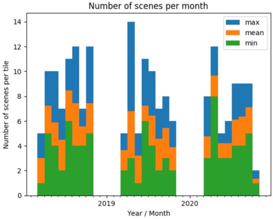 Distribution of available Sentinel-2 images per month for the area of nine tiles constrained by a cloud coverage < 80% and excluding winter months; only March to October scenes are considered.